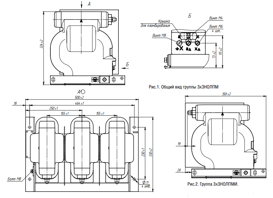 Трехфазные антирезонансные группы изготавливаются в климатическом исполнении «УХЛ» или «Т» категории размещения 2 по ГОСТ 15150. Расположение первичного вывода трансформатора напряжения возможно как с лицевой (ЗНОЛПМ), так и с тыльной (ЗНОЛПМИ) стороны трансформатора.