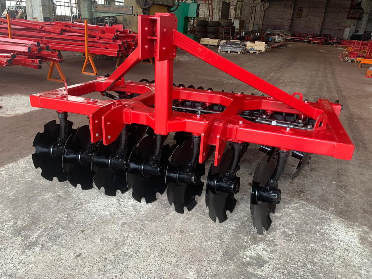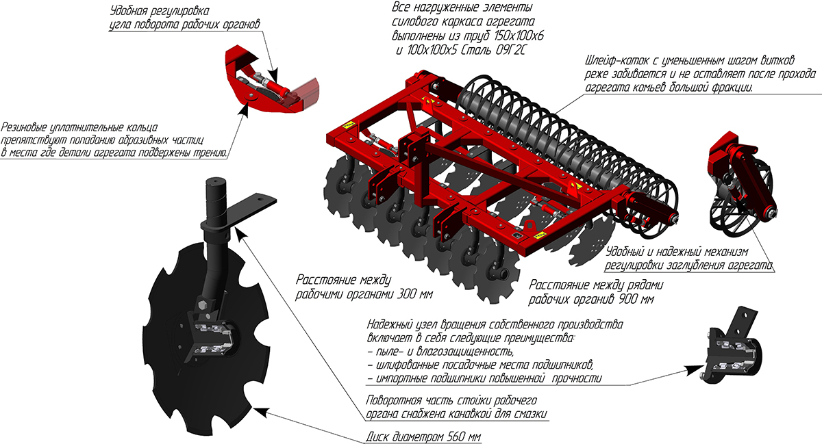 Основным рабочим органом Дисковой бороны является режущий узел. Режущий узел состоит из стойки поворотной и диска. Каждый диск бороны установлен на индивидуальной, обслуживаемой стойке диаметром 60мм, что позволяет бороне работать на полях с большим количеством растительных остатков, а также обеспечивает высокую ремонтопригодность агрегата. Диск имеет диаметр 560мм, толщину 6мм, расстояние между дисками в ряду 300мм. Конструкция бороны обеспечивает плавную регулировку угла атаки каждого ряда дисков в пределах от 0° до 30°, что позволяет оптимально настроить борону для различных типов почв.