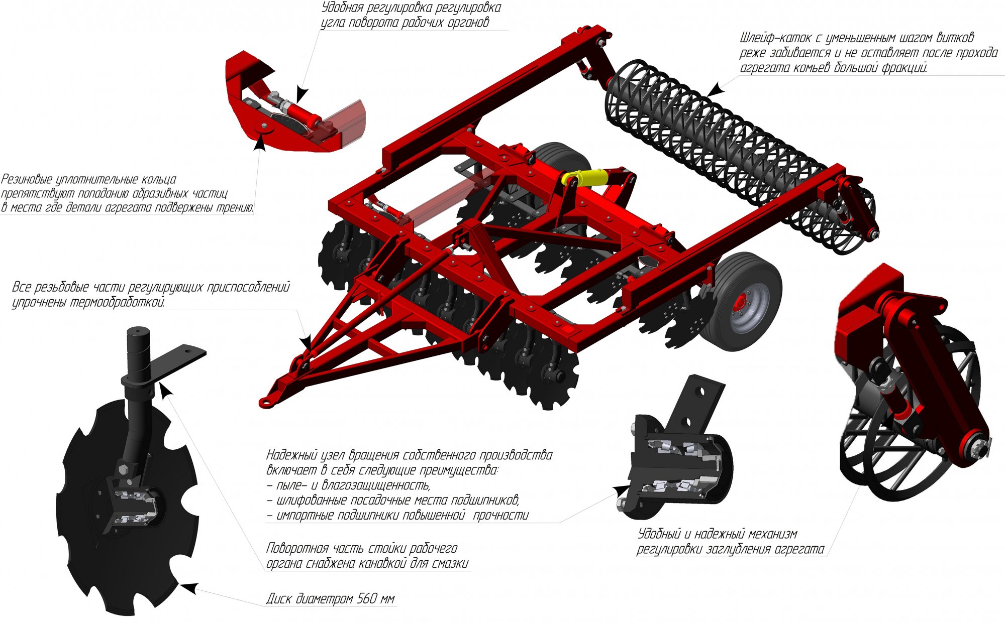 расположением сферических дисков диаметром 560мм, толщиной 6мм, установленных на индивидуальных поворотных стойках диаметром 60мм. Рабочие органы первого и второго рядов отличаются