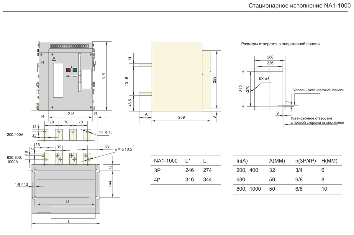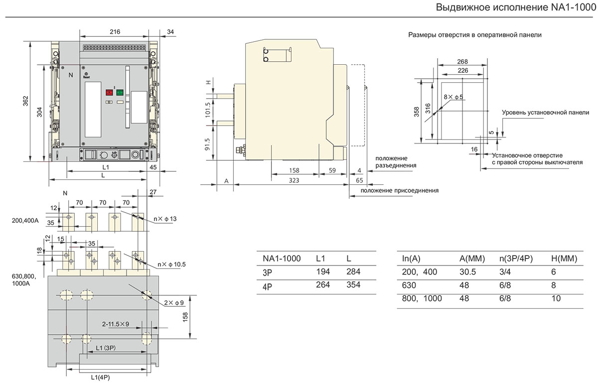 | Номинальный ток In, A | 200 | 400 | 630 | 800 | 1000 | |