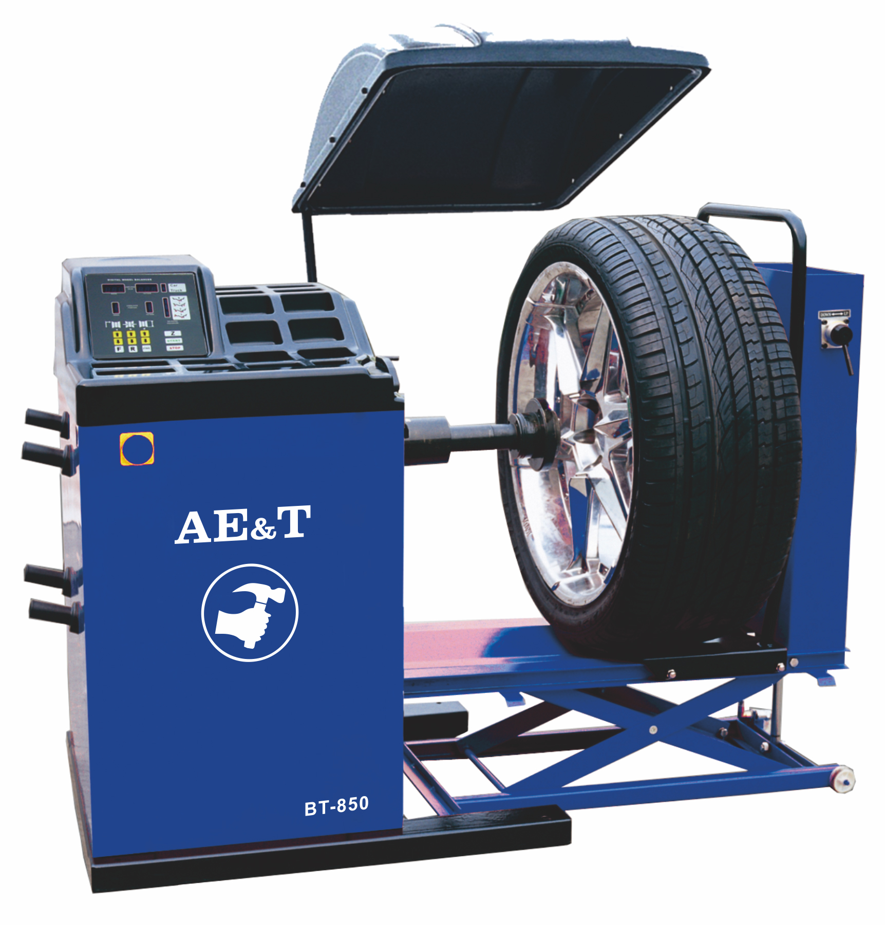 Балансировочный станок с пневматическим подъемным устройством для балансировки колес весом до 135 кг.