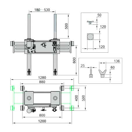 Регулировка каретки по ширине ямы: 800-1200 мм (регулировка осуществляется за счет раздвижения каретки)