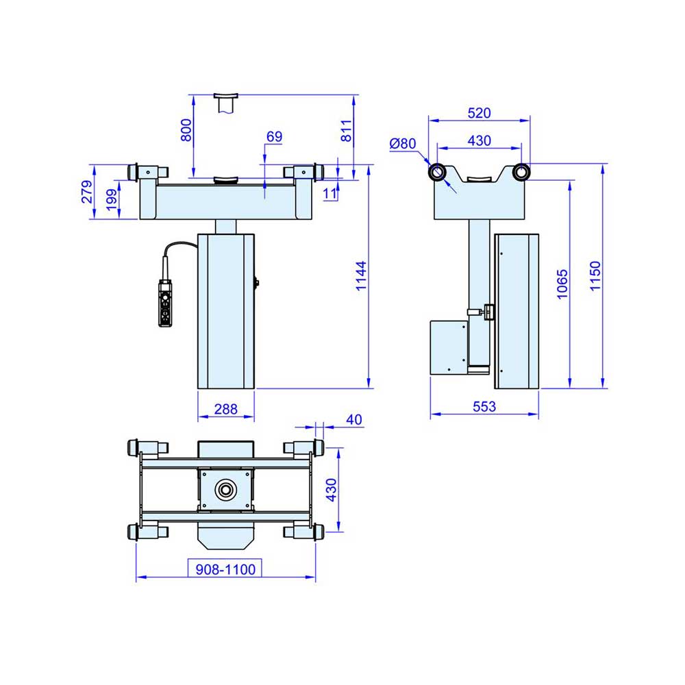Регулировка каретки по ширине ямы: 908-1100 мм (регулировка осуществляется за счет выдвижения оси колес)