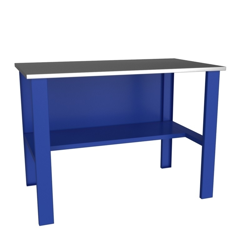 Столешница полностью фанерная и сверху покрыта слоем оцинкованного металла в 1 мм. Толщина фанеры составляет 24 мм. Столешница монтируется на опоры, произведенные из листового металла. Слесарный стол имеет максимально простую конструкцию, включающую одну нижнюю полку, столешницу и 4 опоры. Представленная модель изделия не имеет перфорированного экрана.