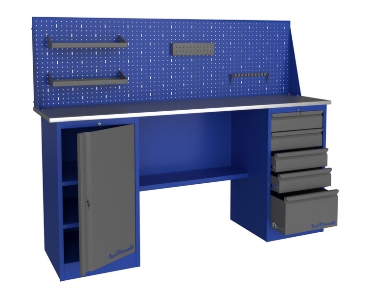 В качестве материала применяется фанера толщиной 24 мм, оцинкованный металл, который покрывается сверху фанеры (для столешницы), листовой металл (для основания изделия). Для покрытия применяется порошковая краска, качество которой остается неизменным при длительной эксплуатации верстака.