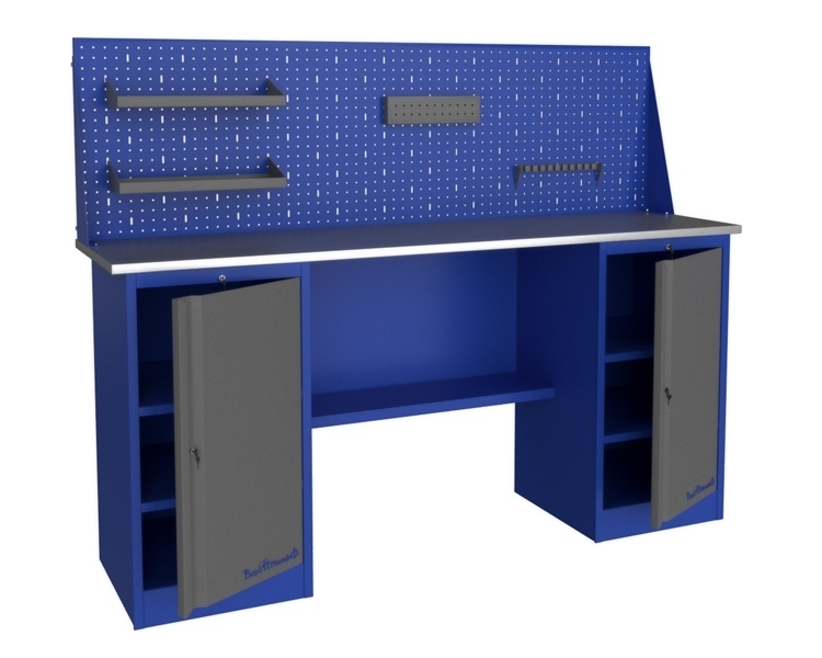 Столешница верстака закреплена на двух вместительных тумбах с дверцами. Тумбы оснащены полками, на которых можно хранить рабочие инструменты, запасные детали и материалы. Для надёжной сохранности инвентаря и деловой документации на дверцах предусмотрена возможность закрепления замочка.
