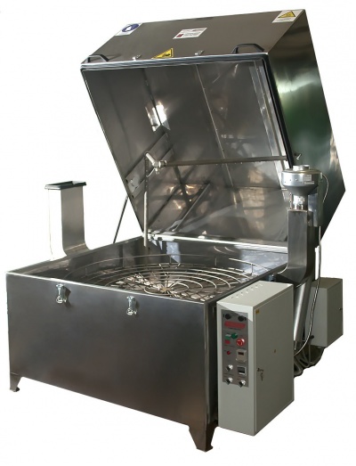 Температура и продолжительность цикла обработки задается на панели управления. Вращение корзины обеспечивает необходимое позиционирование деталей перед коллекторами. П-образная форма рамп позволяет промывать изделия сверху, снизу и сбоку в течение заданного времени. Автоматические промывочные установки серии АМ предназначены для использования со слабощелочными растворами. Для наполнения бака используется обычная водопроводная вода.