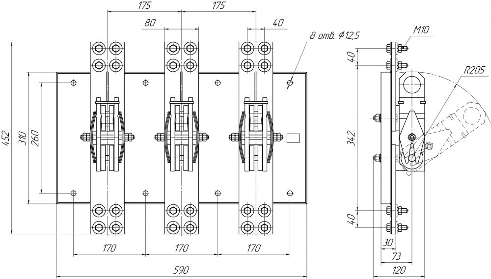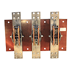 Конструкция рубильника Основными частями аппаратов являются ножи, совмещенные и контактные стойки с выводами для подключения, смонтированные на общей плите (100...400А - металлическая плита, 630А - текстолитовая). Рубильники имеют по одному ряду совмещённых и контактных стоек. Необходимое контактное нажатие обеспечивается пружинами, на совмещённых - сферическими шайбами. У аппаратов контактные ножи связаны осью, приводящейся в движение посредством симметрично расположенных по длине тяг, второй конец которых шарнирно соединён с валом. На рубильниках вал приводится во вращение боковой съёмной рукояткой (или приводом), устанавливаемой на одном его конце. Рубильники с центральным расположением привода приводятся в движение скобой связанной с осью контактных ножей. Рубильник Р-3545 2000А включение/выключение происходит за счет пополюсного оперирование штангой (не входит в стандартную комплектацию).