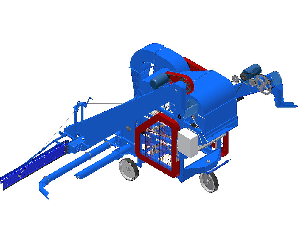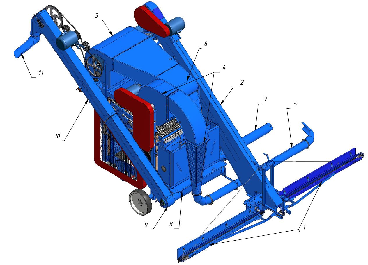 Очистка зерна происходит следующим образом. Скребковые питатели при движении машины вдоль бурта подают исходный материал к подъемной трубе загрузчика, по которой он поступает в приемную камеру.