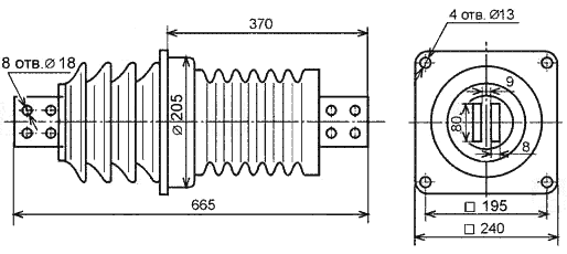Проходные изоляторы ИПУ-10/630-7,5 УХЛ1 состоят из фарфоровой детали, через внутреннюю полость которой проходит токоведущий металлический стержень прямоугольного сечения (шина) или группа шин. Если изолятор поставляется без шин, то встраивание и закрепление токоведущих частей в эти изоляторы производят непосредственно на монтажных участках.