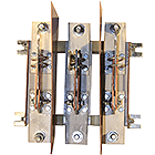 Разъединители серии РЕ19 состоят из изоляционного основания, неподвижных и подвижных контактов, ручного привода. Токоведущие элементы изготавливаются из высококачественной меди марки М1. Изоляционное основание служит базой для сборки основных сборочных единиц и для установки разъединителей на месте монтажа, выполнено в виде изоляторов или изоляционных панелей. На изоляционное основание устанавливаются неподвижные контакты, которые вместе с подвижными контактами образуют полюс аппарата. Неподвижные контакты разъединителей заднего присоединения выполнены из стандартных шин, соединены с изоляционным основанием и выполняют, с одной стороны, функции вывода для присоединения внешних проводников, с другой – для присоединения подвижных контактов. Неподвижные контакты разъединителей переднего присоединения выполнены из стандартных шин и представляют собой Т-образные неразъемные конструкции. Подвижные контакты выполнены из двух медных пластин, которые в неразъемном контактном соединении закреплены на оси и пружинами обеспечивают постоянное контактное нажатие при повороте вокруг оси. В разъемном соединении подвижные контакты при включении разъединителя входят между контактирующими пластинами.