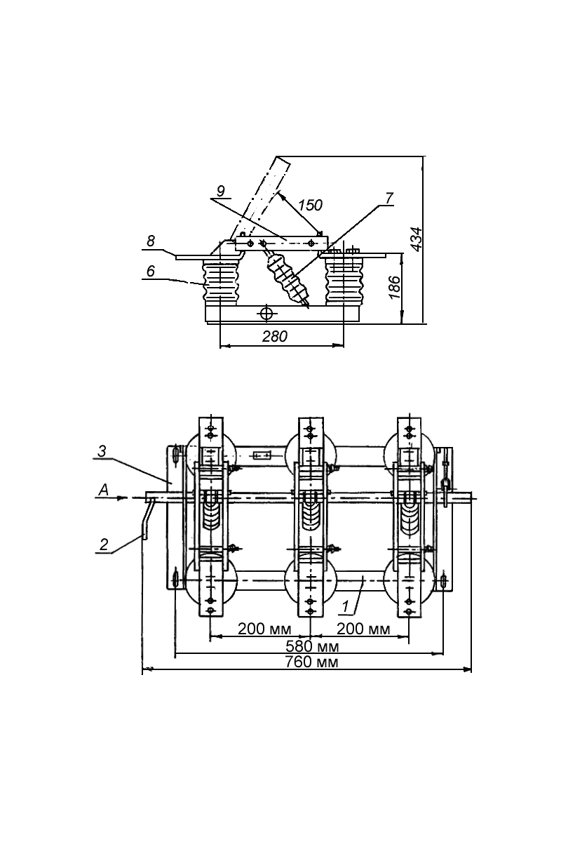 Трехполюсные разъединители РВ-10/1000 У3 представляют собой три токопровода, установленных на одной раме с основным (общим) валом и приводным рычагом.