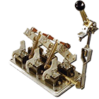 У рубильников с боковым приводом ножи связаны с осью, приводящейся в движение посредством симметрично расположенных по длине тяг, второй конец которых шарнирно соединен с валом, установленным на двух подшипниках. Этот вал приводится во вращение боковой рукояткой, установленной на одном его конце.
