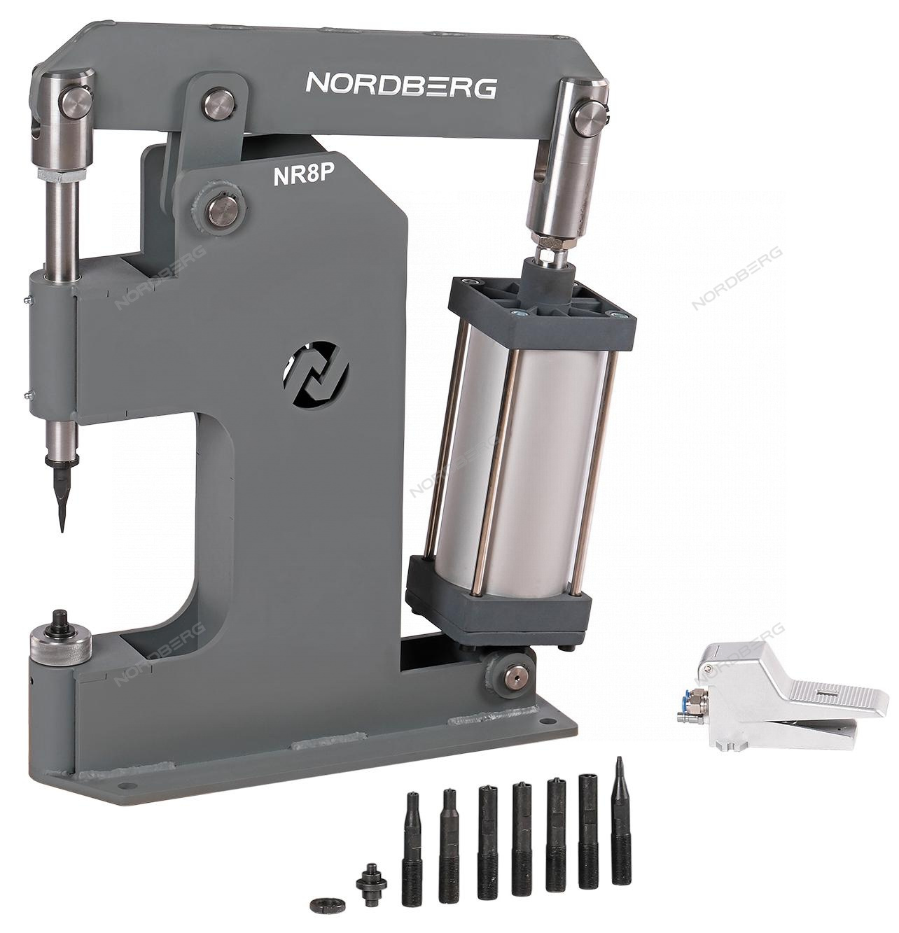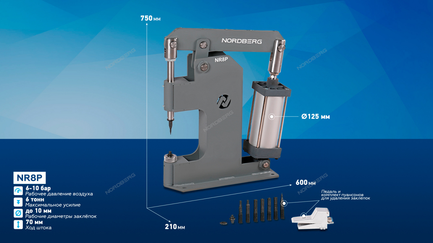 Пневматический станок для заклепки тормозных колодок цилиндр 125 NORDBERG NR8PM предназначен для установки и удаления заклепок диаметром до 10 мм при замене накладок на тормозных колодках и дисках сцепления.