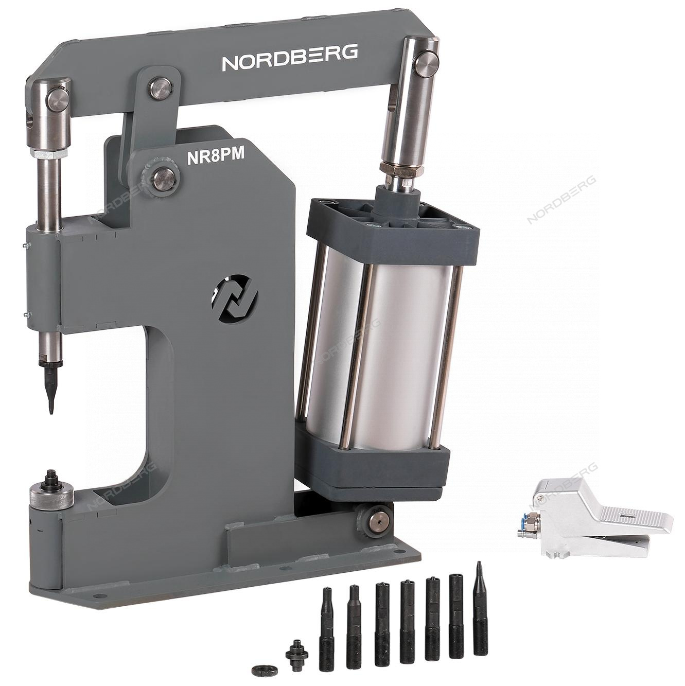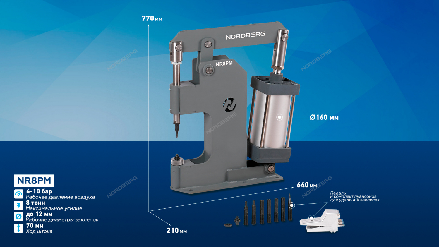 Пневматический станок для заклепки тормозных колодок цилиндр 160 NORDBERG NR8PM предназначен для установки и удаления заклепок диаметром до 10 мм при замене накладок на тормозных колодках и дисках сцепления.