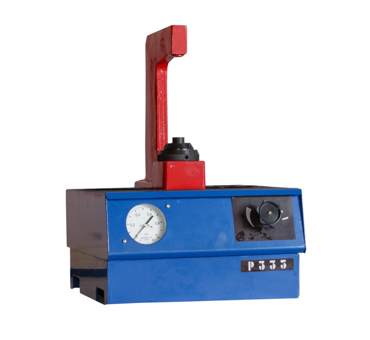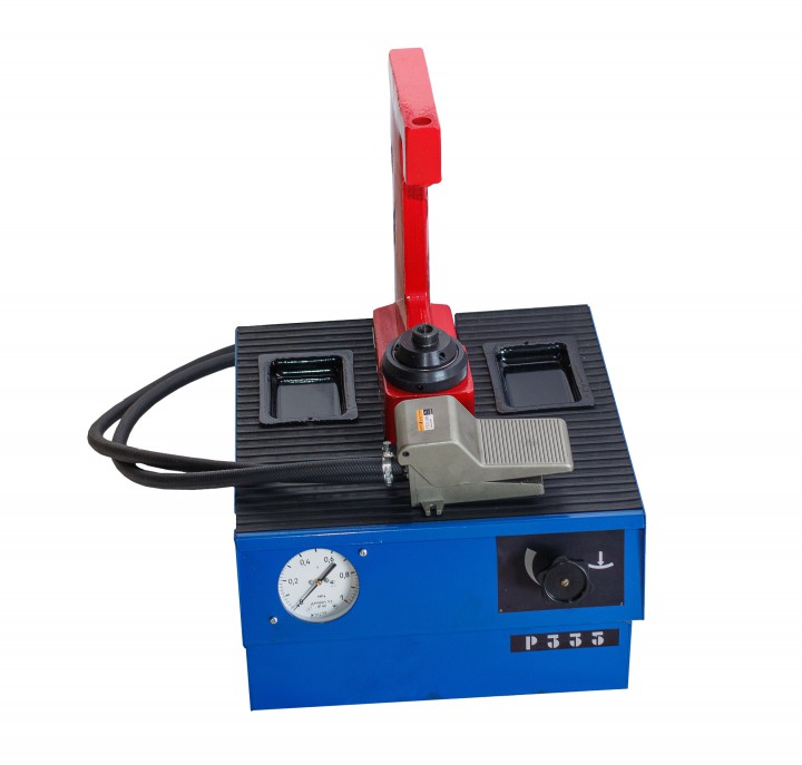 Пресс Р-335, пневматический, настольный, с резинотканевой мембраной рабочей камеры, предназначен для клепки фрикционных накладок тормозных колодок, дисков сцепления и для выпрессовки заклепок диаметром до 10 мм при замене изношенных накладок при ремонте автомобилей на станциях технического обслуживания и автотранспортных предприятиях.