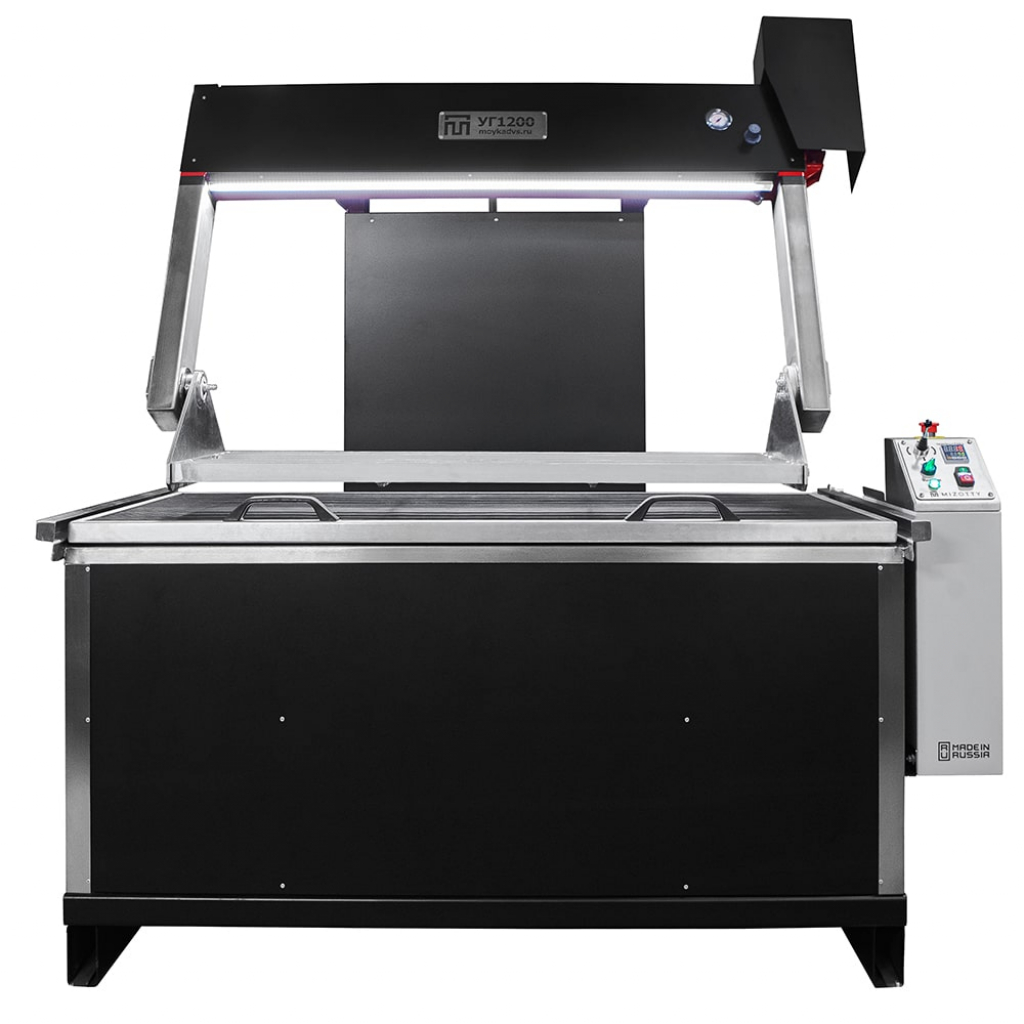 Температура воды в баке доводится до необходимой, при помощи трубчатого электрического нагревателя (ТЭНа). К поворотному столу специальными зажимами, поставляемыми в комплекте, крепится исследуемая деталь. К детали подводится сжатый воздух от пневмосистемы (штатного компрессора). Подъем/опускание поворотного стола осуществляется надежной итальянской гидростанцией. При помощи электропривода вращения стола, деталь поворачивается под любым углом, что обеспечивает доступ ко всем скрытым полостям. Удобный 4-ех позиционный джойстик, расположенный на панели управления, рассчитан на выполнение всех рабочих операций. Контроль давления осуществляется манометром.
