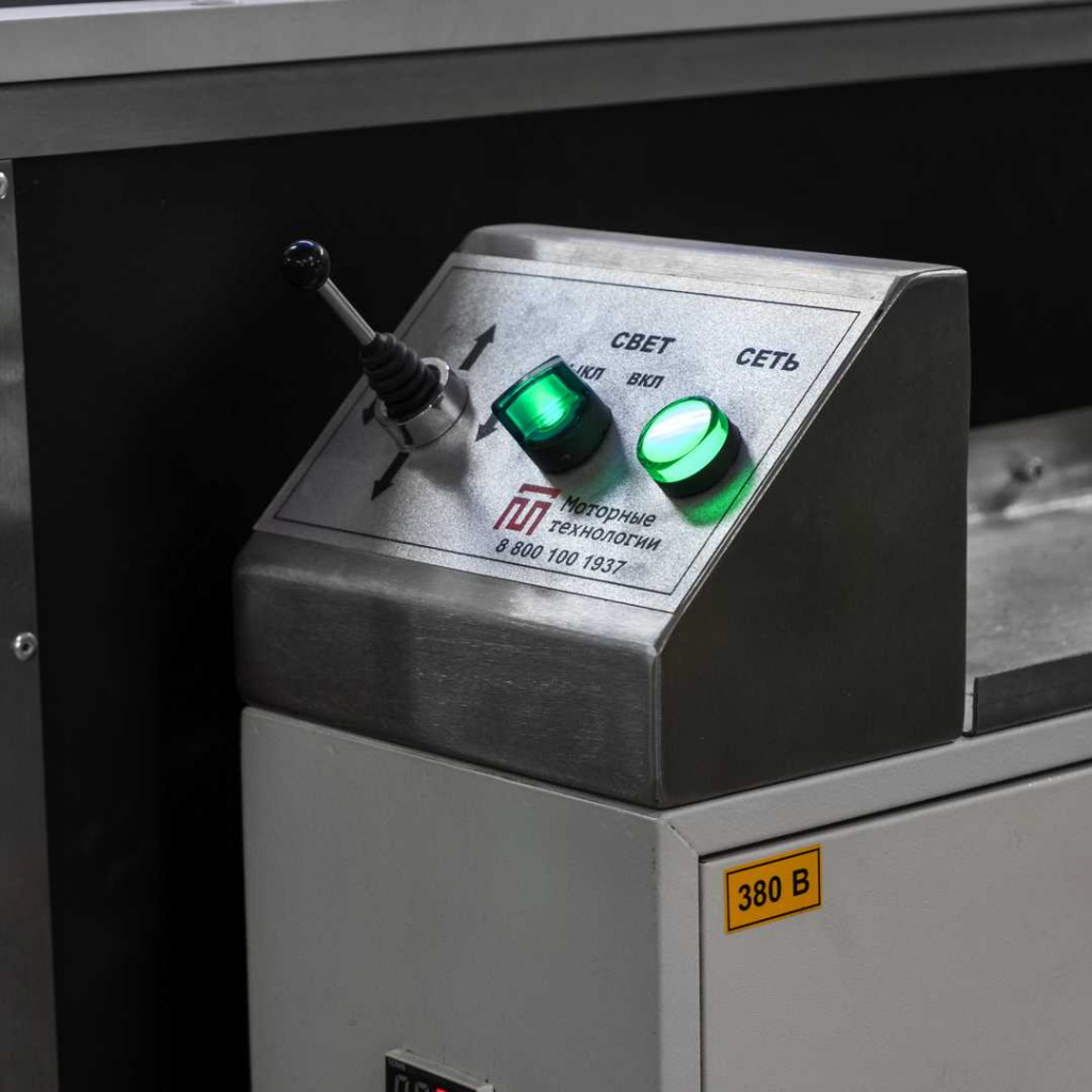 Температура воды в баке доводится до необходимой, при помощи трубчатого электрического нагревателя (ТЭНа). К поворотному столу специальными зажимами, поставляемыми в комплекте, крепится исследуемая деталь. К детали подводится сжатый воздух от пневмосистемы (штатного компрессора). Подъем/опускание поворотного стола осуществляется надежной итальянской гидростанцией. При помощи электропривода вращения стола, деталь поворачивается под любым углом, что обеспечивает доступ ко всем скрытым полостям. Удобный 4-ех позиционный джойстик, расположенный на панели управления, рассчитан на выполнение всех рабочих операций. Контроль давления осуществляется манометром.
