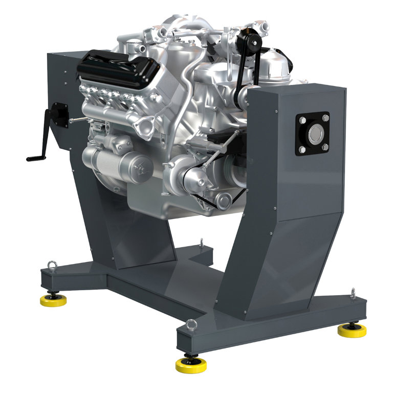 Конструкция стенда позволяет вывешивать ремонтируемый агрегат в удобной позиции для его последующей разборки и сборки. Поворот рамы на 360° позволяет проводить разборку и сборку любых труднодоступных узлов дизельных двигателей и КПП.