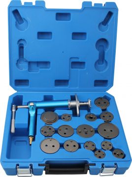 Набор для возврата тормозных поршней, исключающий риск повреждения поршней или резиновых манжет. Набор содержит основной инструмент с пневмоцилиндром для выталкивания шеек поршней. В комплект входят 15 адаптеров. Пригоден для суппортов как с левой, так и с правой резьбой.