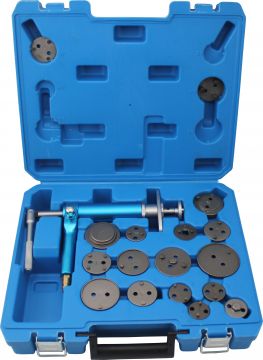 Набор для возврата тормозных поршней, исключающий риск повреждения поршней или резиновых манжет. Набор содержит основной инструмент с пневмоцилиндром для выталкивания шеек поршней. В комплект входят 17 адаптеров. Пригоден для суппортов как с левой, так и с правой резьбой.