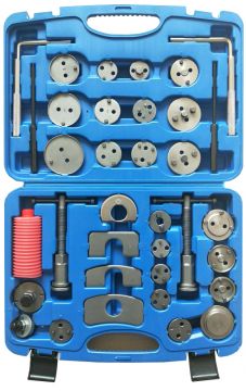 два нажимных шпинделя (с правой и левой резьбой) для возврата поршней в тормозные цилиндры суппортов; 24 адаптера поршня; 6 мм и 7 мм шестигранные ключи суппорта; 3 мм и 5 мм бородки; 4 специальные пластины для фиксации положения резьбового шпинделя в суппорте; емкость с жировой смазкой.